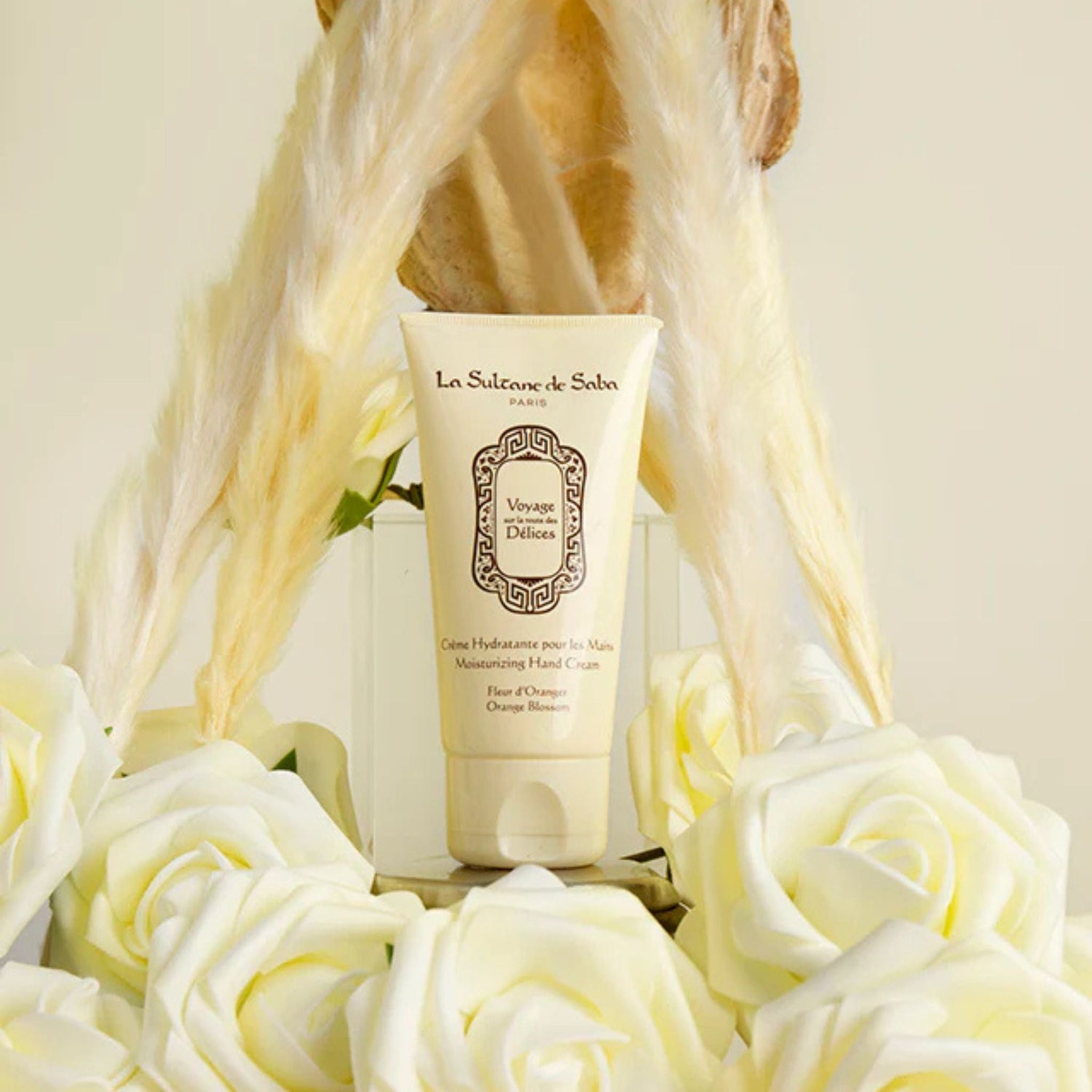 Packaging: The Hand Cream Orange Blossom La Sultane de Saba is elegantly packaged in a soft cream-colored squeezable tube, exuding simplicity and refinement. The matte finish gives the packaging a clean, luxurious appearance, ideal for daily use and display. The tube is compact and travel-friendly, with a secure flip-top cap at the base for easy and mess-free dispensing.